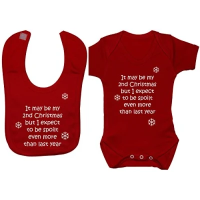It May be My 2nd Christmas but I Expect to Spoilt Even More Than Last Year. Baby Grow Bodysuit Romper T Shirt Vest & Feeding Bib Set 18 24 Red