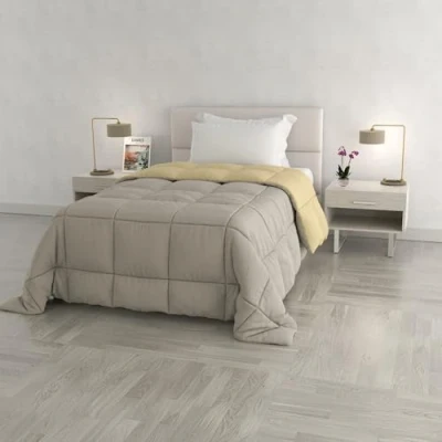 “ELEGANT” bicolor winter quilt, available in three different sizes and in several color combinations. Wintery article with a 300 grams padding This product has entirely been designed, planned and made in Italy SINGLE: 170x270cm Made of Microfiber subjected to “Peach Skin” treatment that gives to the fabric the softness and silky sensation of a peach. Oeko-Tex certification guarantees the total absence of toxic substances during the whole productive process and consequently the complete respect for the environment The quality of the fabric and the accurate finishes make of that product one of the most requested and beloved items