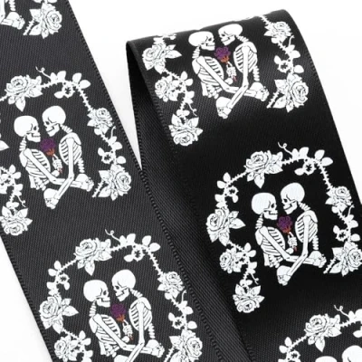 Skelton Romance Ribbon suitable for Halloween, Gothic, Steampunk, Day of the Dead Celebrations 100% Polyester Black Satin Halloween Ribbon 38mm Ribbon Width 5 Metre Roll Length Perfect ribbon for Halloween craft projects, gift wrapping frightful treats, decorating spooky party bags, embellishing creepy garlands, wreathes baskets and bouquets