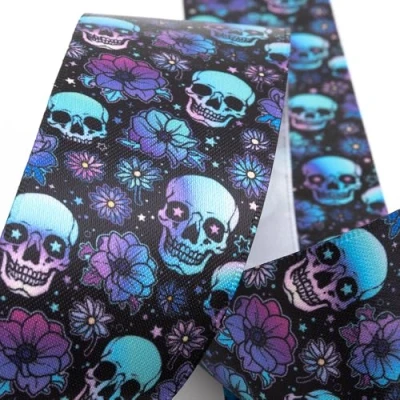 Skull Heads and Flowers Ribbon suitable for Halloween, Gothic, Steampunk, Day of the Dead Celebrations 100% Polyester Black Satin Halloween Ribbon 38mm Ribbon Width 5 Metre Roll Length Perfect ribbon for Halloween craft projects, gift wrapping frightful treats, decorating spooky party bags, embellishing creepy garlands, wreathes baskets and bouquets