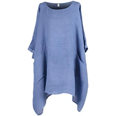 Italian Plain Ladies Tunic Top Womens Lagenlook Quirky Short Sleeves Linen Dress (Denim, One Size(Fit UK 22 38))
