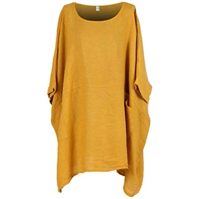 Italian Plain Ladies Tunic Top Womens Lagenlook Quirky Short Sleeves Linen Dress (Mustard, One Size(Fit UK 22 38))