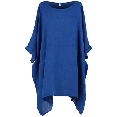 Italian Plain Ladies Tunic Top Womens Lagenlook Quirky Short Sleeves Linen Dress (Royal, One Size(Fit UK 22 38))