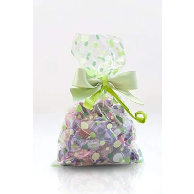 Suitable for food contact, ideal for packaging products such as confetti, biscuits, sweets, candies, foods in general but also medium-small gifts Very practical and colourful, ideal for events such as weddings, birthdays, parties and ceremonies Plastic material (polypropylene) thickness 30 microns (my) transparent and durable, 100% made in Italy Dimensions: 15 x 25 cm (15 cm base and 25 cm high) 50 pieces per pack, gift ribbon not included, dark green and light bubbles
