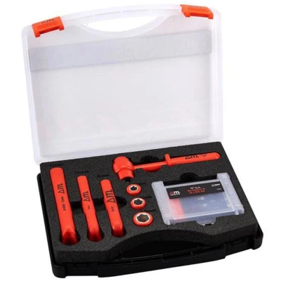 ITL 19 Piece Insulated Socket, Ratchet, Spanner and Bit Set designed for use on DC batteries. All items in this set are manufactured from injection molded nylon thermoplastic, and are 100% tested to IEC60900, Category C and ASTMF1505. They are designed to withstand extreme impact, abrasion, and are flame retardant. ITL tools are 100% tested using 1000 volts for 3 minutes submerged in water. Lifetime guarantee on the tool and insulation. Supplied in tool case with inserts for easy storage, transport and access. Contains: 1 x 1/4in Ratchet 3 x Sockets: 8, 10, 13mm 3 x Ring Wrenches: 8, 10, 13mm 1 x 1/4in Bit Adaptor 3 x Hex Bits: 4, 5, 6mm 2 x Phillips Hex Bits: PH1, PH2 6 x Torx Bits: 10, 15, 20, 25, 30, 40