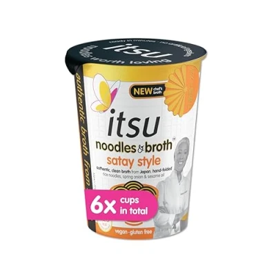 Restaurant inspired noodles & broth created in partnership with chef & TV presenter Monica Galetti. Simply add hot water for a light and convenient lunch, supper or snack ready in just 5 minutes itsu satay style noodles & broth are gluten-free, vegan and low in fat and sugar. Each cup contains just 223 calories. For a hearty meal, top noodles & broth with an egg, green leaves, fresh veg, cooked meat or prawns. Or add a swirl of soy sauce, sesame oil or fresh chilli.