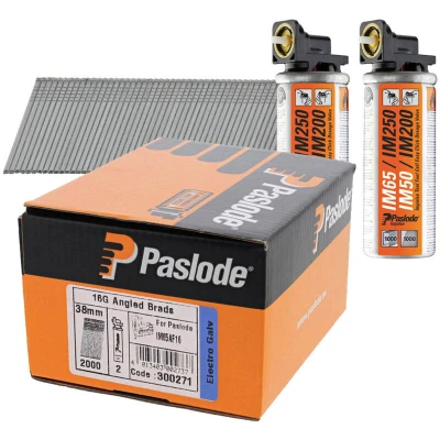 General description The Paslode Angled Brad Nail Fuel Pack includes 2,000 pieces of 16 gauge nails, designed for use with the Paslode Impulse IM65A F16 Angled Nailer. These nails feature an electro-galvanised finish, ensuring durability and excellent performance in indoor applications. Technical specifications Fastener Length: 38mm Nail Diameter: 1.6mm Nail Head Type: Brad head Nail Surface Treatment: Electro galvanised Finish: Galvanised Zn and chromate minimum: 7µm Pack Size: Box of 2,000 Number of Fuel Cells: 2 Compatibility and accessories Compatible with Paslode Impulse IM65A F16 Angled Nailer Usage Ideal for applications requiring a strong and stiff nail for consistent drivability Creates smaller holes for excellent finishing Secured with specific glue to prevent fracturing if dropped Other information All Paslode nails are CE Marked, ensuring compliance with European regulations.