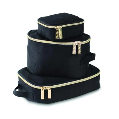 Itzy Ritzy Packing Cubes Set of 3 or Travel Organizers; Each Cube Features a Mesh Top, Double Zippers and Fabric Handle; Black with Gold Hardware