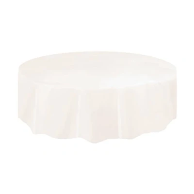 1 Plastic Ivory Round Table Cover Ivory Plastic Tablecloth measures 7ft (2.13m) in diameter Protects your table against spills, stains and drinks rings at a wedding, bridal shower, anniversary party or baby shower Disposable table cover makes your after party clean-up really quick and convenient Search for other ivory tableware, ivory party decorations and party supplies from Unique Party, Manufacturer: Unique Party