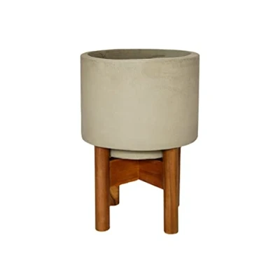 Ivyline Vigo Round Grey Concrete Planter with Wooden Stand Stylish & Waterproof Durable Contemporary Decorative Indoor Flower Pot H37cm x D28cm