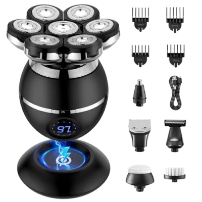 【Convenient to Carry】This bald head shaver is ergonomically designed, it has both a sense of grip and beauty, there is no paint process on metal surface, make the mens shaver more durables and not easy to be broken. The shavers for men is lightweight and portable, easy to put in a backpack or suitcase, will meet your shaving needs anytime, anywhere. It is also a choice to send to father, boyfriend, husband or son on Christmas, birthday and other holidays 【2025 Upgraded Head Shavers for Men】The head shaver for bald men uses double-layer durable blade to accurately capture long and short hairs, which are precise, sharp and safe. The double net provides protection and reduces irritation. The intelligent induction system effectively prevents hair pinching. This head shaver increase the contact area with the head to help you finish shaving faster. Accurately follow your face or head's contour and provide a complete hair removal experience 【6 in 1 Razor Gift Kit】The electric razor for men includes 6 detachable accessories: 7D Rotary Shaver, Nose/Ear Hair Trimmer, Hair Trimmer (3/6/9/12mm), Facial Massage Brush, Facial Cleaning Brush, Body Trimmer and Sideburn Trimmer. This professional 6-in-1 Grooming Kit fulfills all your personal facial shaving needs for beard and hair. All the heads of our beard trimmer feature skin-friendly and durables blades 【Waterproof & Easy to Clean】The mens head shaver adopts IPX7 waterproof technology, allowing for both wet and dry shaving. You can use it with shaving cream in the shower. This electric razor enables fast and time-saving cleaning. The electric shaver can be disassembled, opened upwards, and each blade can be rinsed directly under the tap, making it easy to clean 【Wireless & USB C Charging & LED Display】The men's electric shavers supports wireless and various USB devices for charging. 1.5 hours of fast charging can provide 90 minutes of working time. The electric shaver for men features an LED display that allows you to easily check the battery level. It is durable, sustainable, energy-saving, and cost-effective. NOTE: Make sure to recharge the head shaver before the first-time use