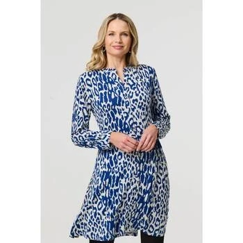 Izabel London Animal Print Long Sleeve Short Shirt Dress for Women UK with a tie Waist, Made from Viscose Blend. Blue