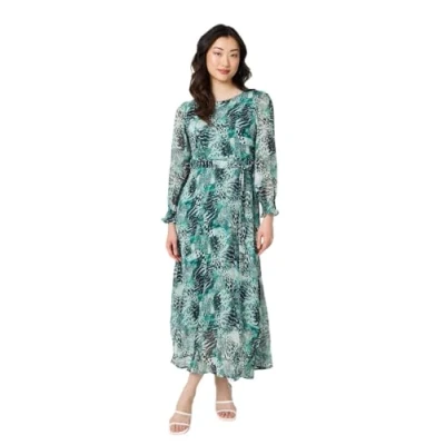 Izabel London Animal Print Semi Sheer Maxi Dress for Women UK with Long Puff Sleeves and a tie Waist.