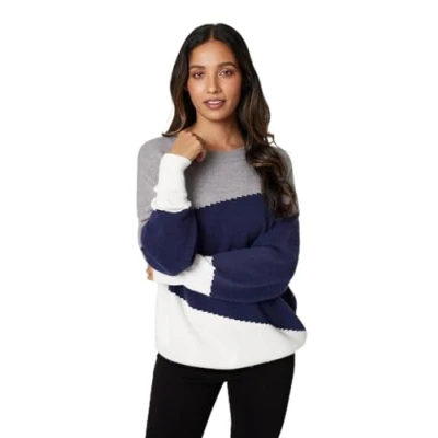 Izabel London Colour Block Relaxed Knit Sweater for Women UK with Round Neck, Long Sleeves and Hip Length Hem. Navy