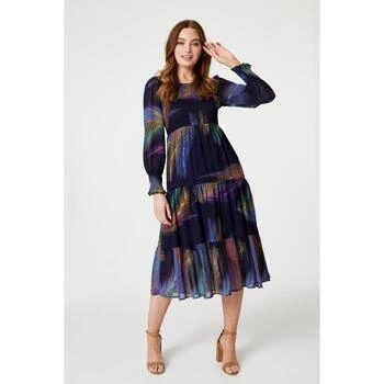 Izabel London Feather Print midi Smock Dress for Women UK with Round Neck, Long Sleeves and Tiered Skirt. Multi Blue