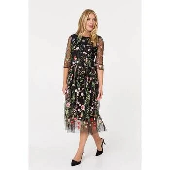 Izabel London Floral Embroidered Mesh Midi Dress women's Long Dress in Black