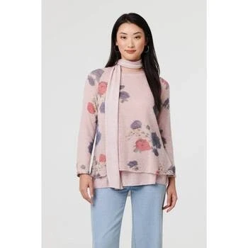 Izabel London Floral Layered Tunic Top for Women UK with Scarf, a Round Neck and Long Sleeves. Pink