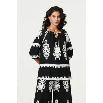 Izabel London Ikat Print Tassel tie Neck Blouse for Women UK with a Drawstring and 3/4 Sleeves.