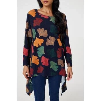 Izabel London Leaf Print High Low Tunic Top for Women UK with Round Neck, Long Sleeves and Hanky Hem. Navy