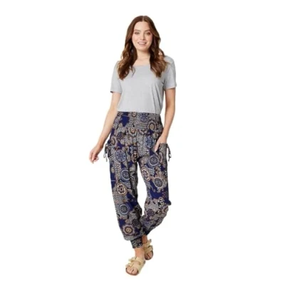 Elevate your casual wardrobe with these printed harem pants. With a high elasticated waist, side pockets with a tie detail, a relaxed fit and a full length hem tapered at the ankle. Made from 100% lightweight viscose they're a great go-to weekend style option. 8- Waist 21.7", Length 39.8" Pockets Full length hem Tapered