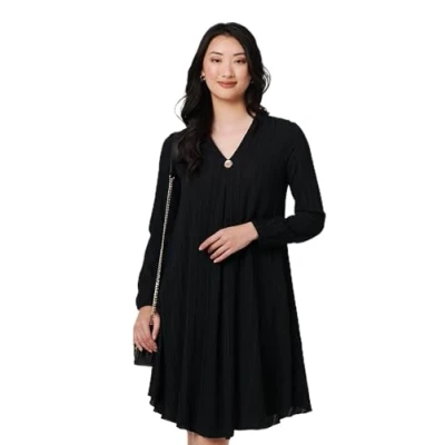 Izabel London Pleated V Neck Long Sleeve Swing Dress women's in Black