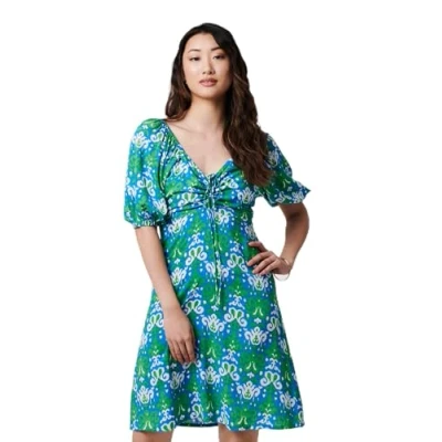 Izabel London Printed Tie Bardot Neck Short Dress for Women UK with 1/2 Puff Sleeves, Made from 100% Viscose. Green