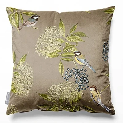 Izabela Peters Cushions With Covers Included, Filled Cushion, Eco Friendly Velvet Cushions, 45 cm, Bird on Elderflower Taupe, Chair Sofa Seat