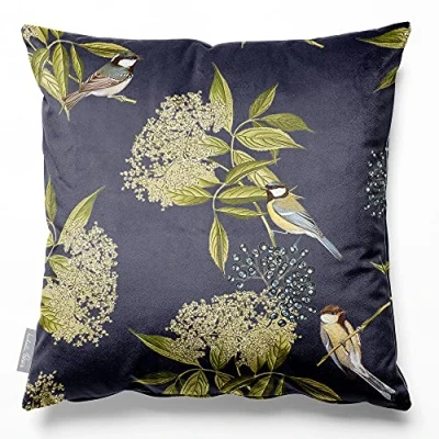 Izabela Peters Cushions With Covers Included, Filled Cushion, Eco Friendly Velvet Cushions, 50 cm, Bird on Elderflower Graphite, Chair Sofa Seat