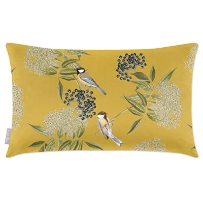 Izabela Peters Cushions With Covers Included, Filled Cushion, Eco Friendly Velvet Cushions, 55 x 35 cm, Bird on Elderflower Mustard, Chair Sofa Seat