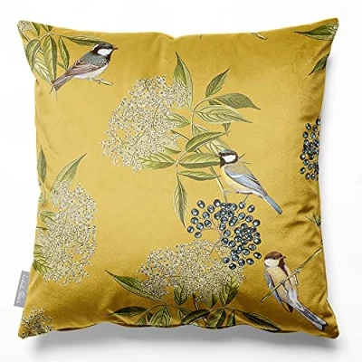 Izabela Peters Cushions With Covers Included, Filled Cushion, Eco Friendly Velvet Cushions, 60 cm, Bird on Elderflower Mustard, Chair Sofa Seat