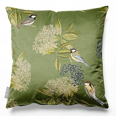 Izabela Peters Cushions With Covers Included, Filled Cushion, Eco Friendly Velvet Cushions, 60 cm, Bird on Elderflower Sage, Chair Sofa Seat