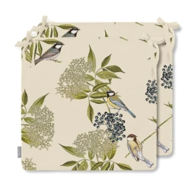 Izabela Peters Luxury Outdoor Waterproof Chair Seat Cushions Set Of 2 High Density Foam Pads for Garden Furniture, Indoors & Outdoors Dining Chairs Bird On Elderflower Cream