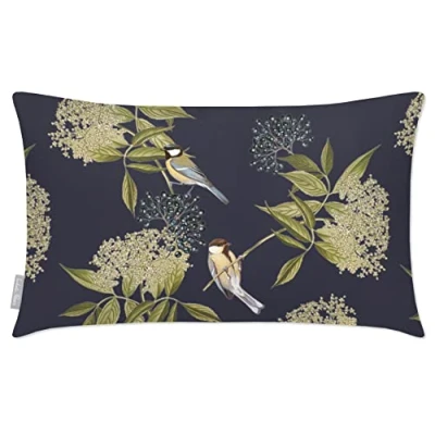 Izabela Peters Outdoor Cushions Waterproof, 55 x 35 cm, Filled Cushion, Bird on Elderflower Graphite, Garden Furniture Cushions, Seat Chair