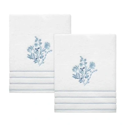 INCLUDES: (2) Bath Towels QUALITY: 100% Cotton CARE INSTRUCTIONS: Machine washable, tumble dry low ADD STYLE: Intricately embroidered floral design in light-to-medium blues on a white terry ground with coordinating medium blue ticking stripes. COLLECTION: Mix and match with other items from our collection! Add style to your home.