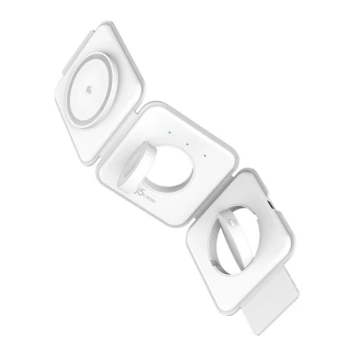 The j5create JUPW3215W Qi2 3-in-1 Magnetic Travel Wireless Charging Station delivers fast 15W magnetic wireless charging for iPhone 12 series and Android phones, plus charging for Apple Watch and earbuds. Its foldable, travel-friendly design offers multiple configurations and comprehensive safety protections for convenient, on-the-go charging.