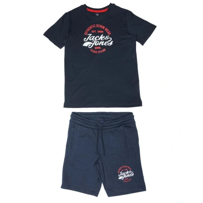 Secret SalesJunior Boys Jack Jones Brat T- Shirt & Short Set in navy.- T- Shirt: - Crew neck.- Short sleeves.- Jack Jones printed logo on the chest.- Straight hem.- 100% Cotton.- Shorts: - Elasticated waist with drawcord.- Two side pockets.- Jack Jones printed logo at left thigh.- 60% Cotton 40% Polyester.- Ref:12209085A