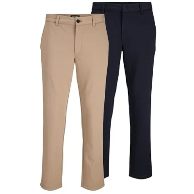 JACK & JONES Pack of 2 men's regular fit chino trousers for versatile looks – two high-quality trousers, a smart deal: this set offers you two classic men's regular fit chino trousers – perfectly combined for business and leisure. Stylish minimalism meets Danish brand quality Stretch comfort meets a perfect fit - The elastic material blend with elastane ensures an optimal fit for both trousers. As men's stretch chino trousers, they offer you the comfort you need in everyday life - without sacrificing style Practical details for a clear appearance - With back and front pockets, medium-high waistband and zip, this duo impresses all the way. Men's fabric trousers that perfectly combine functionality and style awareness Environmentally conscious thanks to recycled polyester - Both men's performance trousers are made from 50% recycled polyester - a clear statement for sustainable fashion. JACK & JONES combines timeless design with responsibility - for men who prefer conscious men's trousers Durable woven fabric for daily use - The robust quality of the woven material guarantees dimensional stability and resistance - even with frequent wear and washing. Two men's trousers that reliably take part in any situation JACK & JONES Danish fashion expertise with over 1,000 stores worldwide – since 1990, JACK & JONES has stood for Scandinavian style, functionality and reliable quality. The brand is now represented in over 1,000 stores worldwide and offers men stylish men's trousers that can be relied on