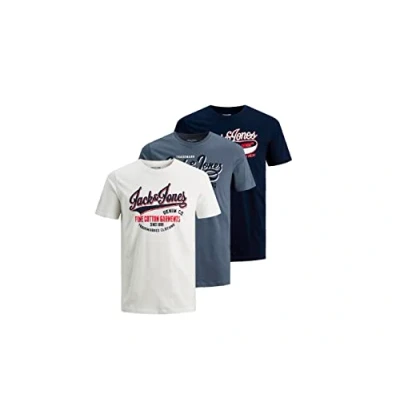 JACK & JONES JJELOGO Men's Designer Crew Neck T Shirt Modern Art Short Sleeve Jersey Cotton Pack of 3, Cloud Dancer/Grisaille/Navy Blazer, XXL
