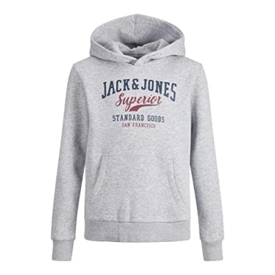 JACK & JONES JUNIOR Boy's JJELOGO Sweat Hood 2 COL 22/23 NOOS JNR Sweatshirt, Light Grey Melange/Print:NB/Rhododendron, 140