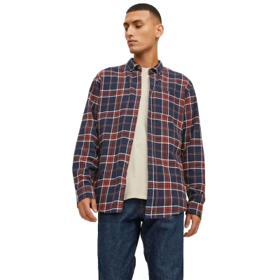 JACK & JONES Mens Slim Fit Check Shirts Long Sleeve Button Down Cotton Flannel Shirt for Men, Dark Orange Colour, Size 2XL