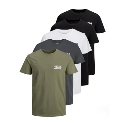 Pack of 5 classic men's T shirts from JACK JONES This pack of 5 contains the colors: 2x Black, 1x White, 1x Dark Grey Melange, 1x Dusty Olive (see pictures) Sustainability: this product contains organic cotton. Organic cotton is grown without harmful chemicals. Growing organic cotton conserves natural resources and protects biodiversity. Print: Pigment print for a soft print on light clothing Short sleeve round neck t shirt