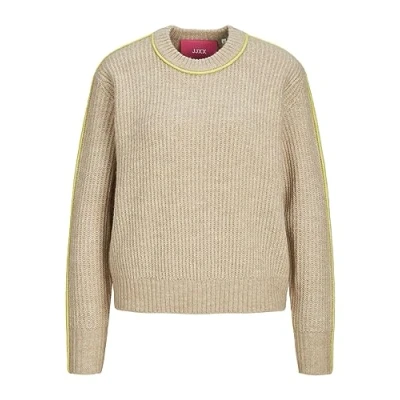 Jack & Jones Women's Jxleonora Various Ribbed Crew Neck Knit Jumper, Peyote/Detail:/Limeade Piping, L