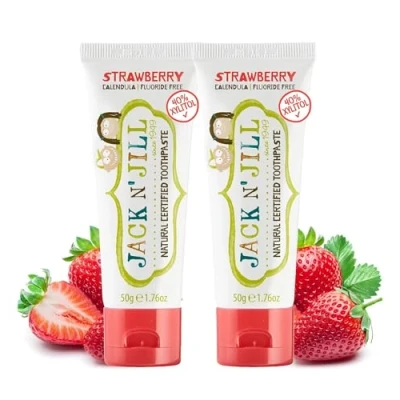 Jack N’ Jill Natural Certified Kids Toothpaste Fluoride Free Toddler & Baby with 40% Xylitol, No Sugar, Suitable from 6 Months+, Organic Strawberry Flavour, Pack of 2 (50g Each)
