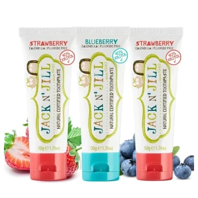 Jack N’ Jill Natural Certified Kids Toothpaste Fluoride Free Toddler & Baby with 40% Xylitol, No Sugar, Suitable from 6 Months+, Pack of 3 (Strawberry 2 x 50g, Blueberry 1 50g)