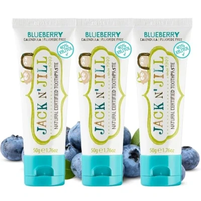 Jack N' Jill Natural Certified Toothpaste Baby & Toddler Toothpaste, Fluoride Free, 40% Xylitol, Sugar Safe for 6 Months and Up, Makes Tooth Brushing Fun, Organic Blueberry Flavour, 3 x 50g