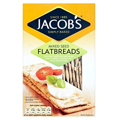 Jacob's Flatbreads - Mixed Seeds (150g) Pack of 2 Please be aware that unless expressly indicated otherwise, Cooking Marvellous are not the the manufacturer of this product. Product packaging may vary from what is shown on this listing. We recommend that you do not rely solely on the information presented on our listing. Please always read the labels, warning and directions provided before using or consuming the product.