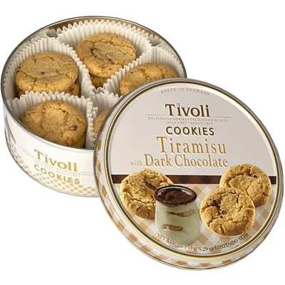 Elevate your snacking experience with Jacobsens of Denmark Tivoli Tiramisu with Dark Chocolate Cookies in a 150g small embossed tin. Savor the harmonious combination of creamy tiramisu and rich dark chocolate cookies in every bite. Whether enjoyed with a cup of coffee or shared with loved ones, this delectable treat is sure to satisfy your sweet cravings and leave a lasting impression. This irresistible blend of flavors offers a symphony of textures and tastes, perfect for those moments when you need a sweet pick-me-up. Whether enjoyed as a luxurious treat for yourself or presented as a sophisticated gift, this decadent snack is a must-have in any gourmet collection. Ideal as a gift for family and friends and can easily be consumed amongst friends as the cookies are portion packed in handy paper cups, which are very easy to serve. Make tea time (or coffee time) interesting with this delicious selection Truly the best Danish cookies in the market!!! Made in Denmark, enjoyed all over the world!