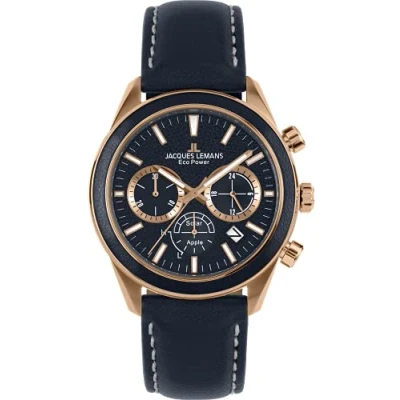 JACQUES LEMANS Men's Watch, Eco Power Watches, Chronograph Made of Solid Stainless Steel with Apple Leather Strap, Model 1 2115, Silver/Green, Strap.