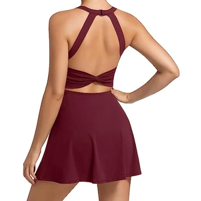 JAFINSY Womens Workout Tennis Dress with Built in Shorts and Bra Athletic Golf Activewear for Exercise, Burgundy, L