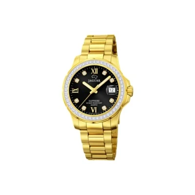Women's analogue watch. Round gold coloured 316l stainless steel case. Gold-plated 316l stainless steel band with deployant clasp. Round black dial. Water resistance: 20 ATM.